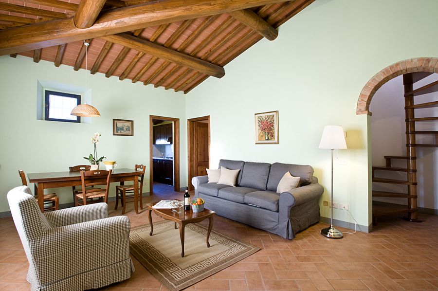 The farmhouse's main house, dating back from the middle of the 1800s, retains all the features of old Tuscan rural buildings. It offers 6 comfortable apartments equipped with all modern amenities. The accommodations, with terracotta floors, exposed wood beams, and country-style furnishings offer guests an atmosphere with an antique taste. The apartments are of various sizes to accommodate from 2 to 6 people.