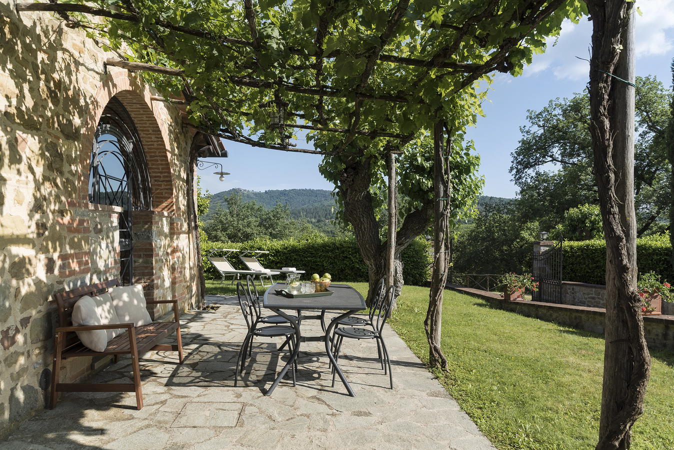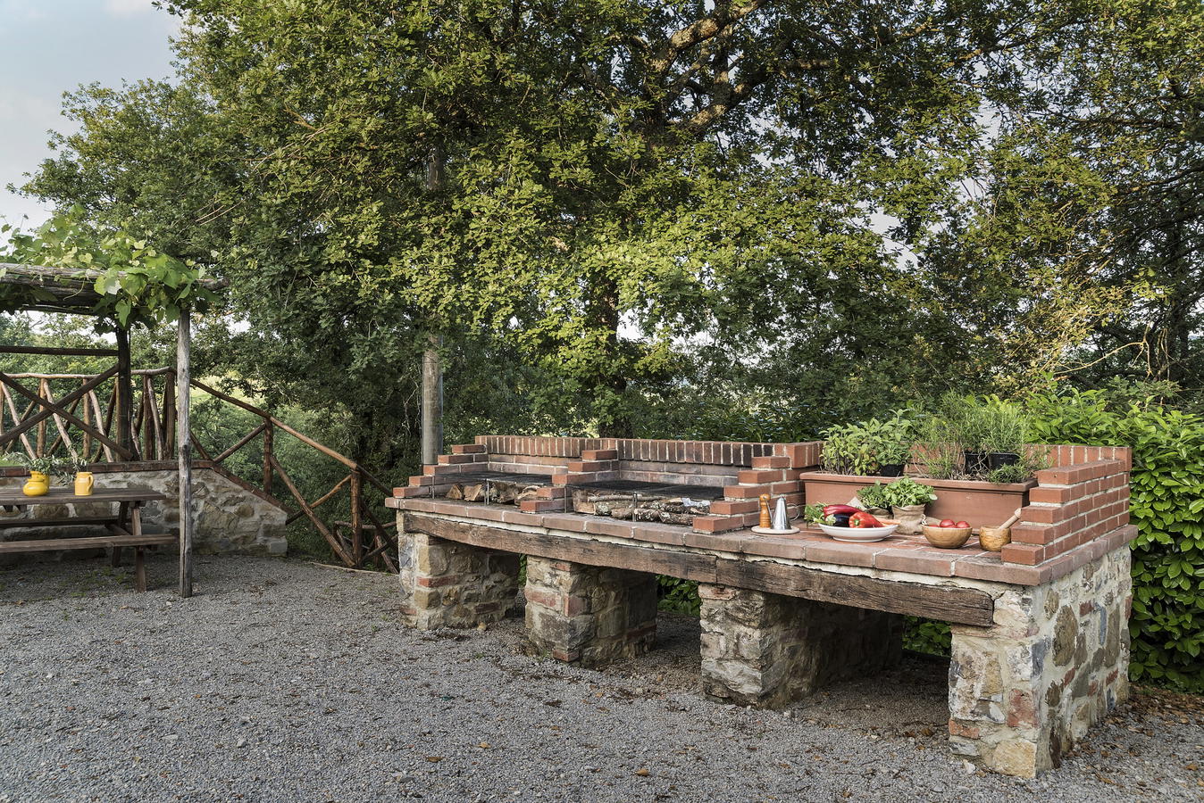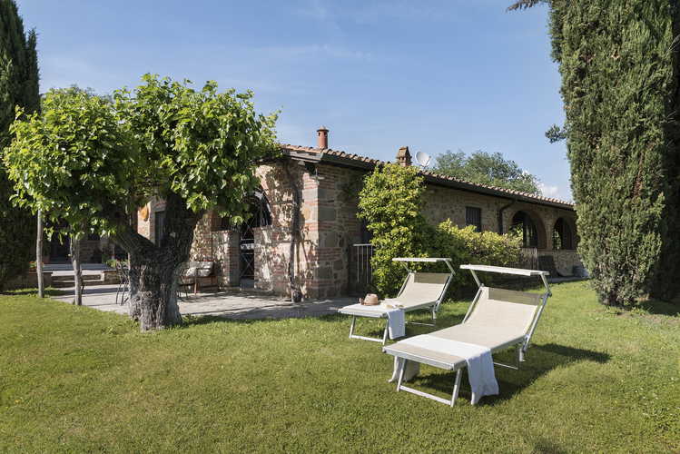 The farmhouse is surrounded by a large garden where guests can relax and enjoy the tranquility of the Tuscan countryside, taking advantage of the benches and tables placed in the shadow of the oak trees.