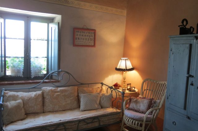 There are three fully restored villas at Borgo Argenina which are the perfect setting for privacy in the rich and diverse Tuscan countryside. Take advantage of Elena’s warm hospitality and wealth of information while staying in one of the three independent self catering villas which offer full kitchens and private terraces. Villa Oliviera is for 4 to 5 persons and offers an intriguing mix of classic decor with a modern design. It was recently featured in the magazine Architecture Digest. This villa has two double bedrooms and two full bathrooms. An ideal combination for friends and family traveling together. The villa features a floor plan with an open living room, kitchen and dining area on the ground floor and two bedrooms on the floor above. Perfect all season long with the cozy, easy to use fireplace.