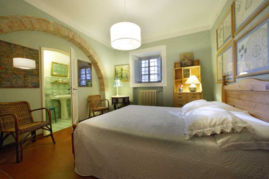 There are 3 double bedrooms available at this charming bed and breakfast each with its own personality and private bath. “Neri” is located on the ground floor with tints of green featuring a handsome stone arch and unique artwork. Up the stairs, on the first floor, are the remaining two bedrooms boasting a wonderful view over the well-tended garden and vineyard covered surrounding hills. There is the "Martina" room in shades of pale yellow and blue with a romantic four poster bed. Then there is the "Mattia" room with open wood beam ceiling and authentic terracotta floor, with a full bath with a tub.