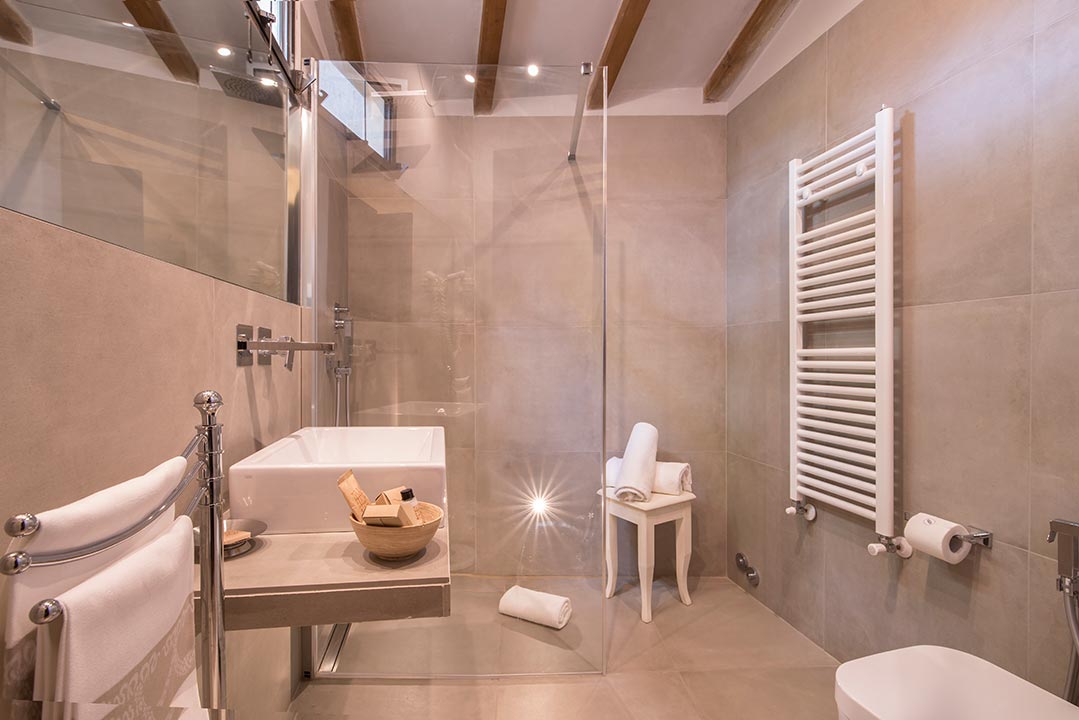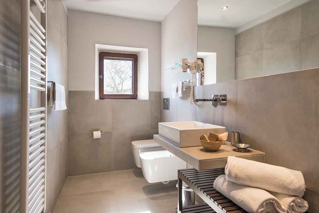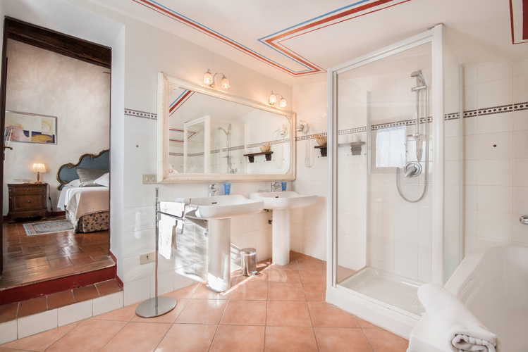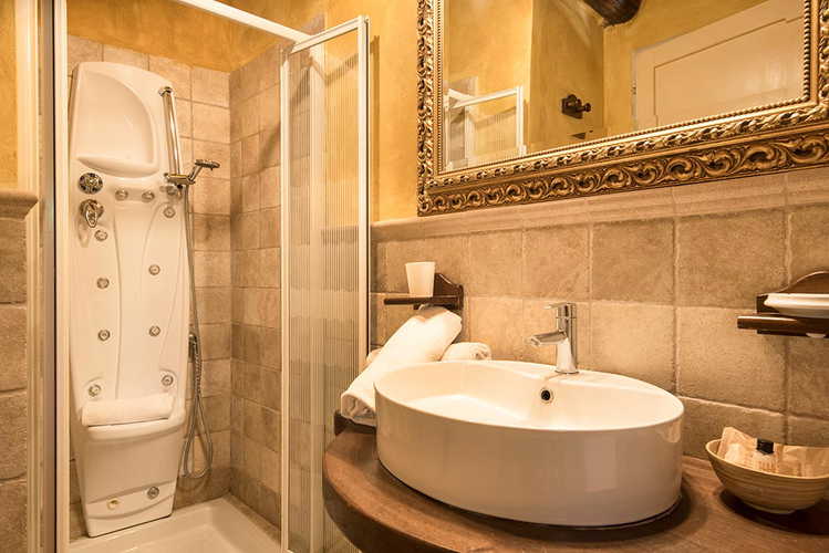 There are three large suites with living room areas that include sofa beds for families with children or friends travelling together and require extra privacy. The “Studio” room boasts a private patio surrounded by the fragrant plants natural to the Tuscan landscape. The family suite “Alba” will accommodate up to 5 persons, with a separate large living room and a beautiful balcony.