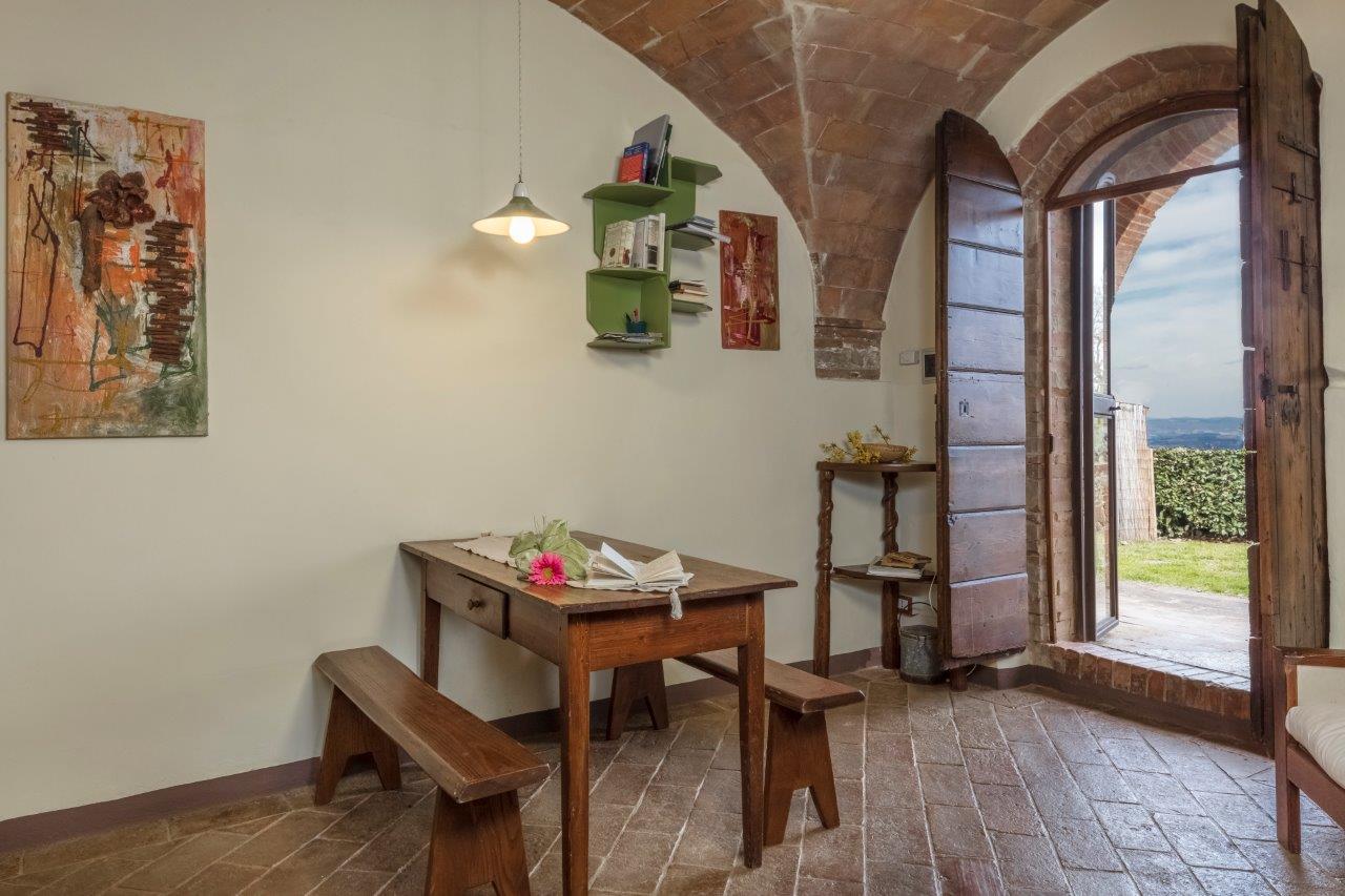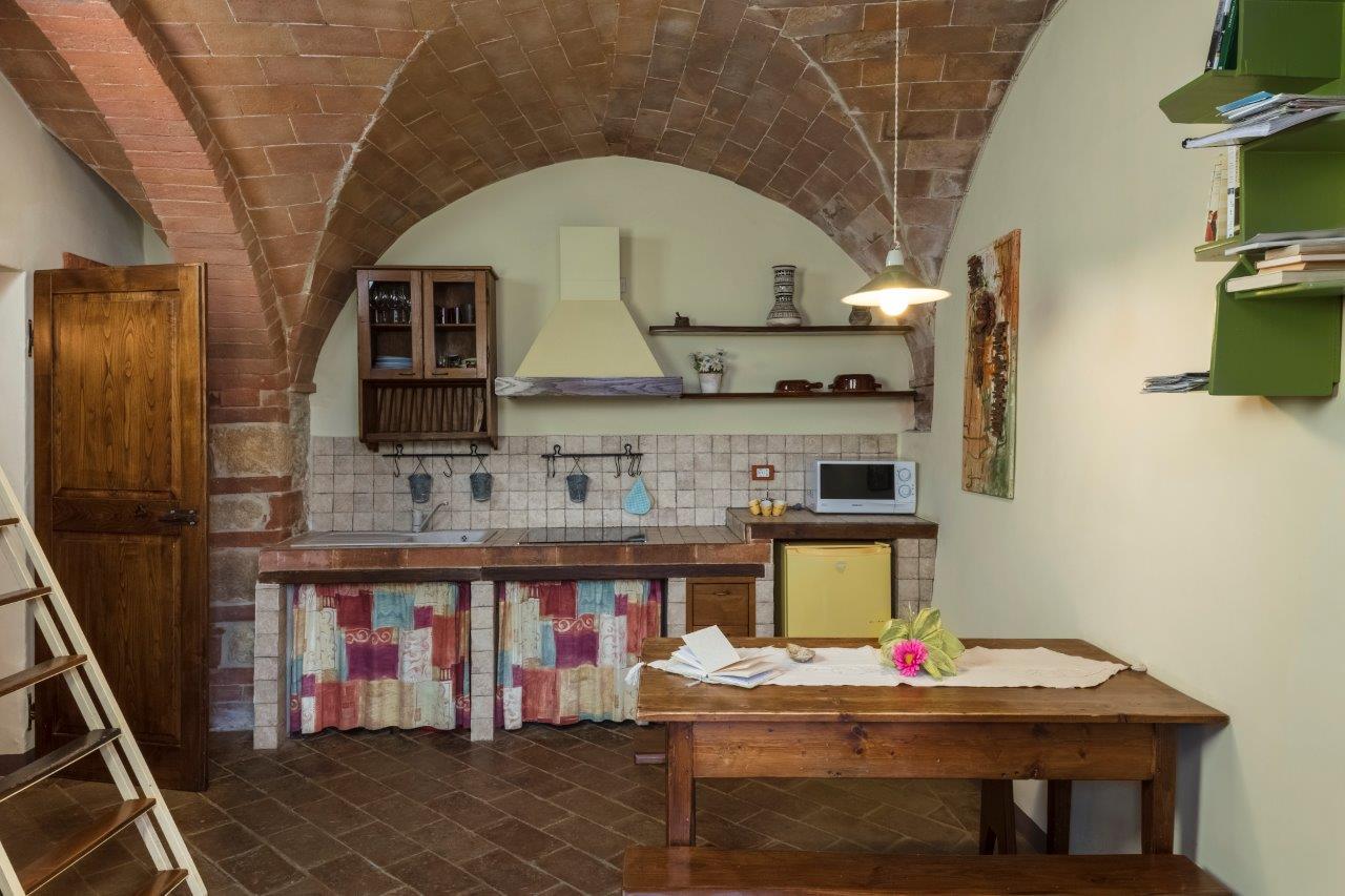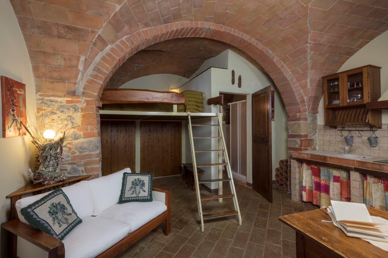 Casa Simona, is a smaller apartment perfect for two people: situated on the ground floor, it has an independent entrance with private garden and parking. There is one large room - besides the bathroom - which encompasses all the charm of this typical Tuscan holiday house: upon entry, you'll find the living room - with sofa, TV, tables and chairs - a fully equipped kitchenette and a double bed located on a wooden loft looking on to the living room. The vaulted red brick ceilings and complementary forniture complete the romantic picture of this small, but cozy and welcoming apartment.