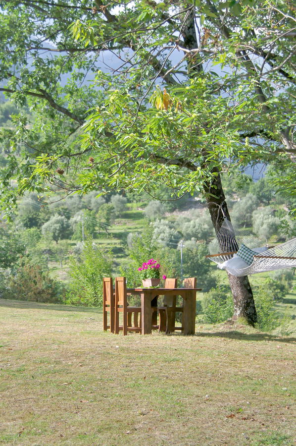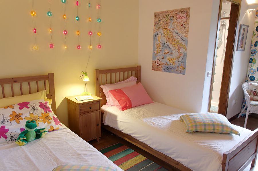 All of the bedrooms, named after the mountain peaks, are located on the first floor, and feature wood beam ceilings, a creative decor and light colored parquet floorings. There are a total of four bedrooms for two persons each and three full bathrooms, plus a half bath on the ground floor. Montagna Bocco, the master bathroom, has an en suite bathroom furnished with a shower and a tub. This bedroom also has a ceiling fan and french doors leading to the shared covered terrace. The double bedroom Del Gioco shares a bathroom and shower with Montagna Nueto, the only room with two single beds. The romantic bedroom and en suite bathroom La Torre, features a Florentine style fresco.