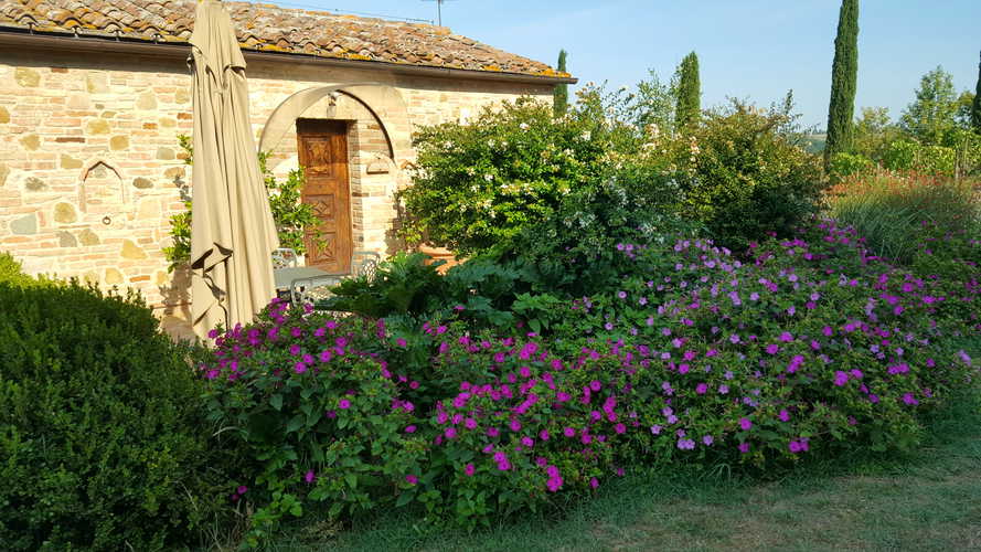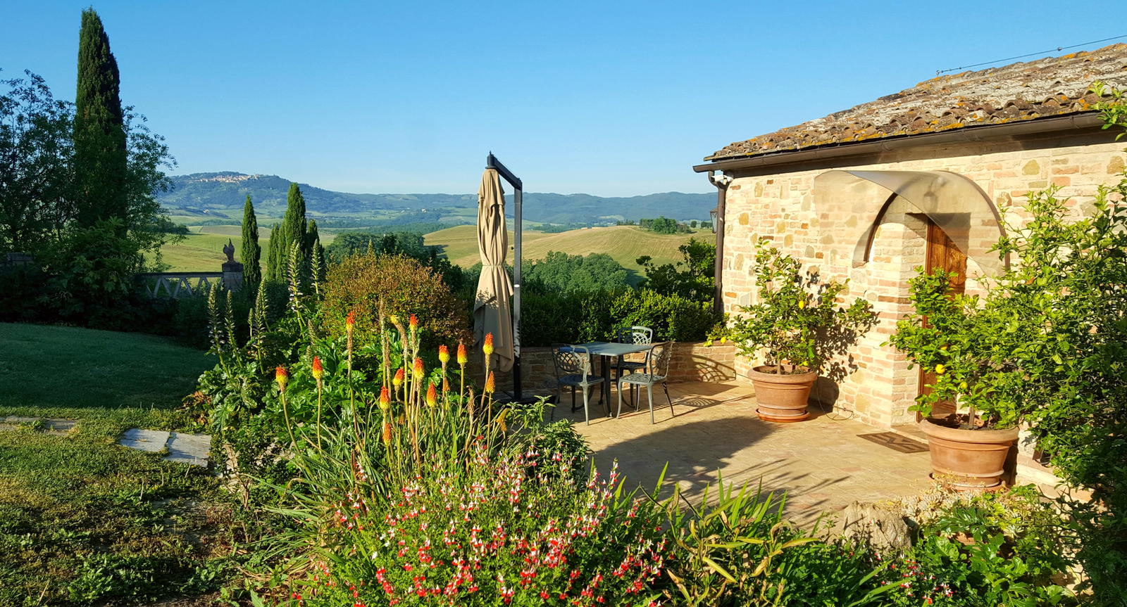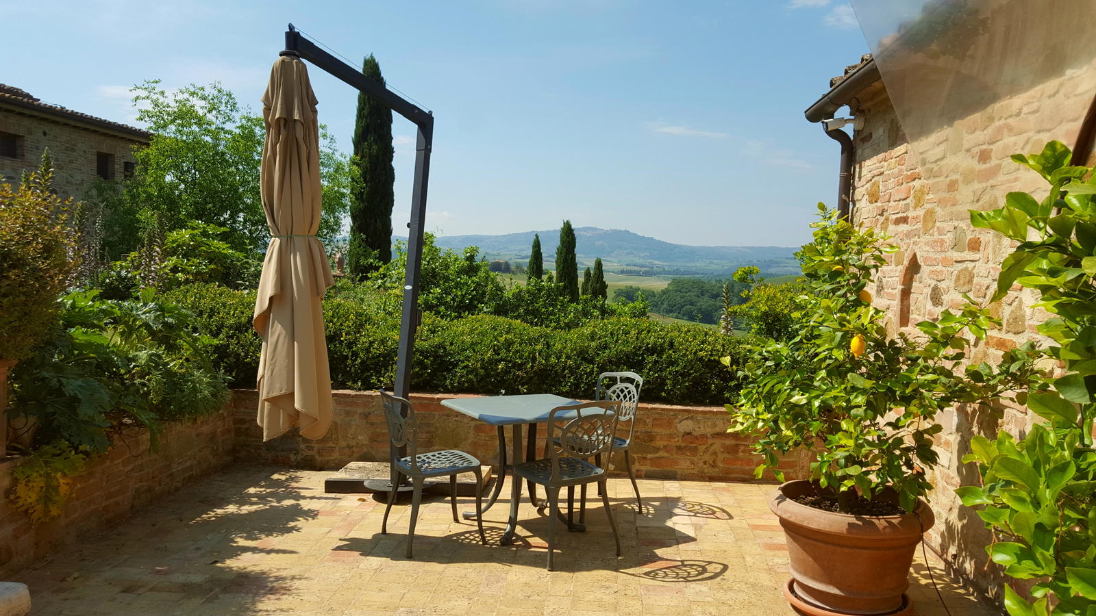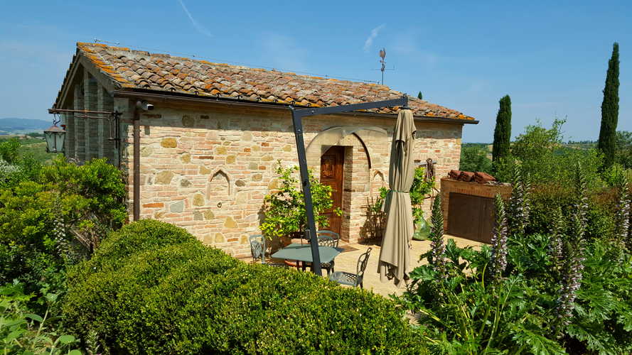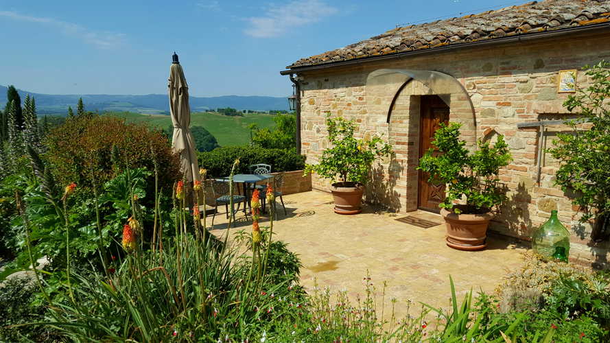 The Podere Cunina farmhouse and Myrtus apartment is just outside of Buonconvento, to the south of Siena, in the Crete Senesi right along the border with the Val d'Orcia region. The main farmhouse has 7 other independent apartments, with Myrtus being the only one set off by itself offering more privacy, its own terrace and open view of the hillside. Guests share the outdoor salt water pool that enjoys panoramic and breathaking views of the surrounding Tuscan countryside.