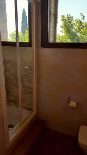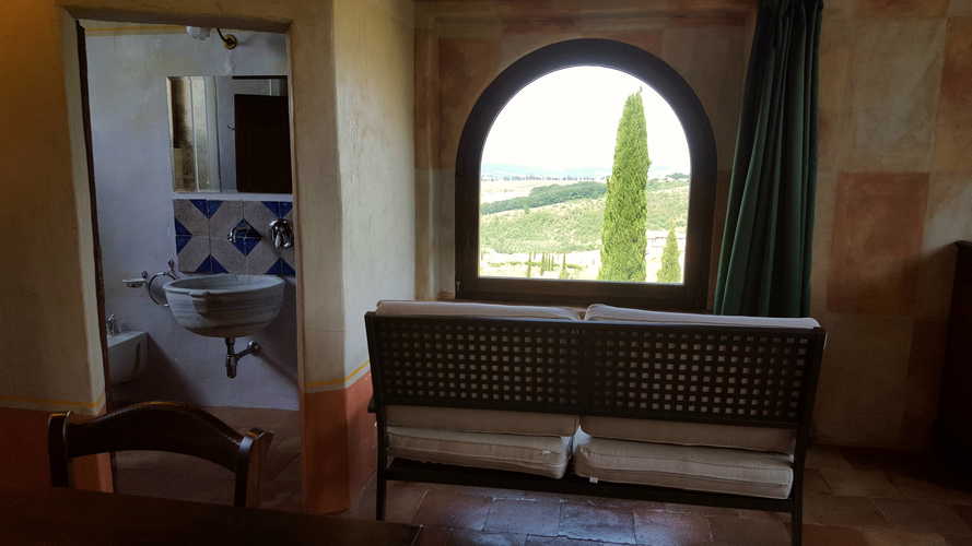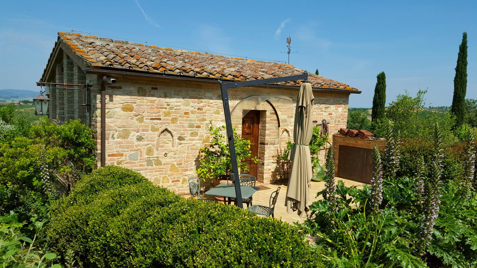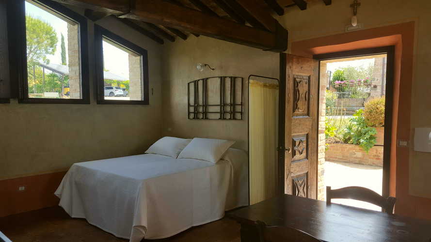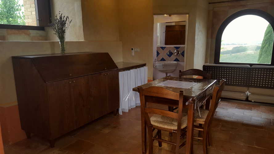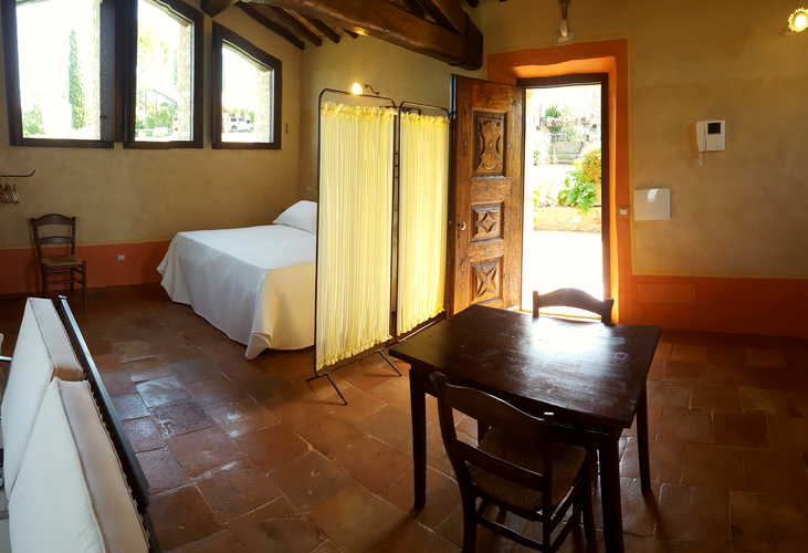 Originally one of the buildings set for housing rural equipment on the farm, the stone and brick house has been renovated with original materials conserving its Tuscan countryside charm. Set with 9 large windows, the studio apartment is very luminious, has amazing views on to the rolling hills around the farmhouse and stupendous sunsets can be enjoyed directly from inside the apartment.
