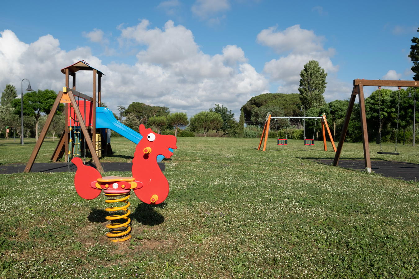 Independent apartments surrounded by green spaces, a pizzeria on site, pools for all ages.