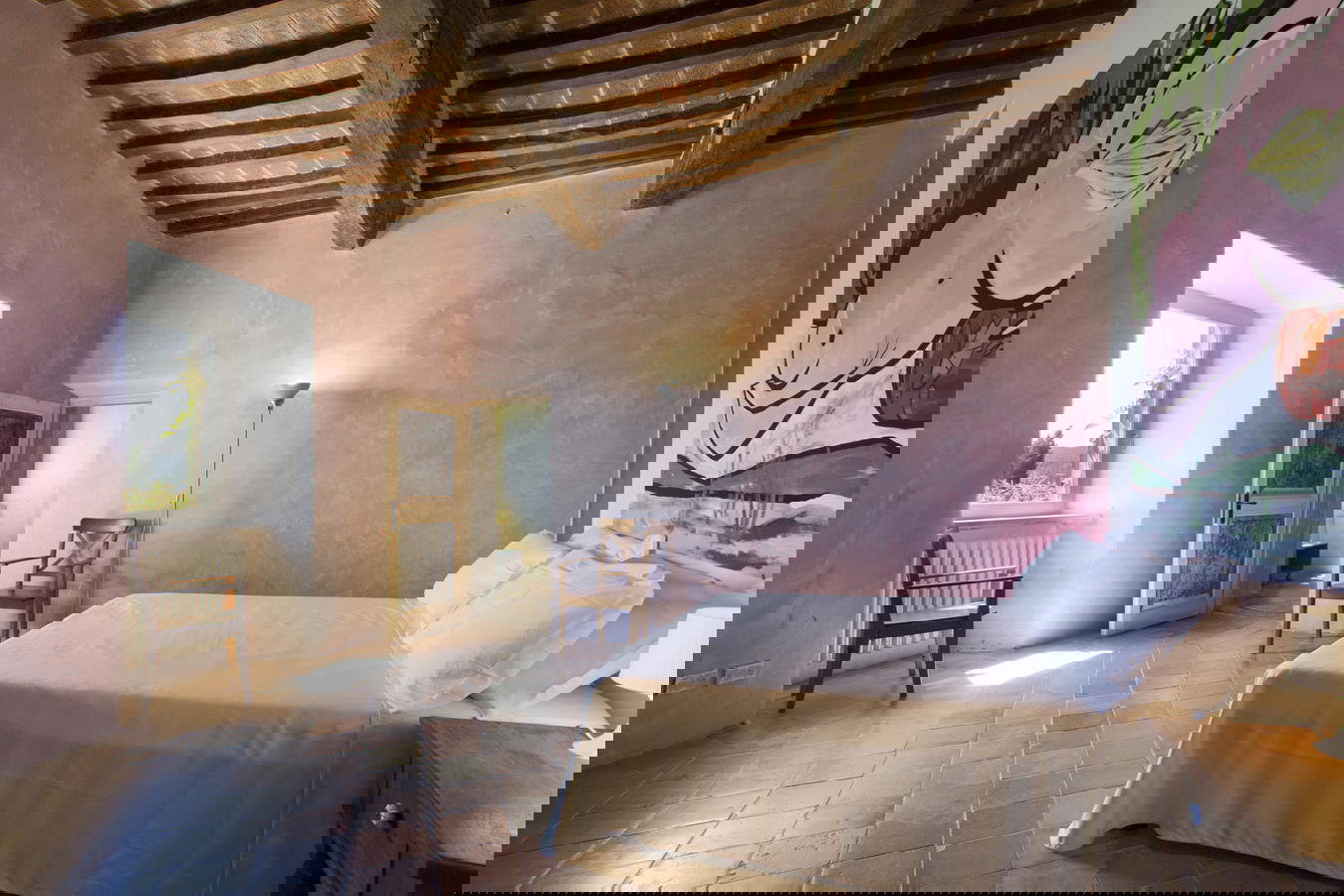 The decision to restructure this unique building of Tuscan history was made with a resolve to reuse as much of the original framework as possible while adding eco-sustainability features such as bio-mass heating and reuse of rain and used water. Set on several floors, the farmhouse is made of classic Tuscan gray "pietra serena" stone with the accent of red bricks. The interiors exalt the wooden beam ceilings, terracotta floors and the unique niches and architecture that characterize a countryside home.