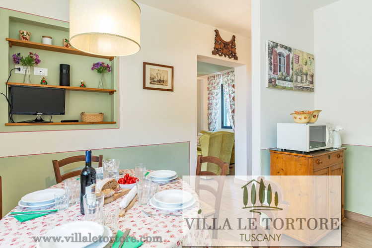The villa spreads out over 100 square meters over 2 floors and hosts up to 5 guests (a baby cot and high chair can also be provided upon request). The villa is perfect for a family or two couples or friends traveling together in Tuscany.